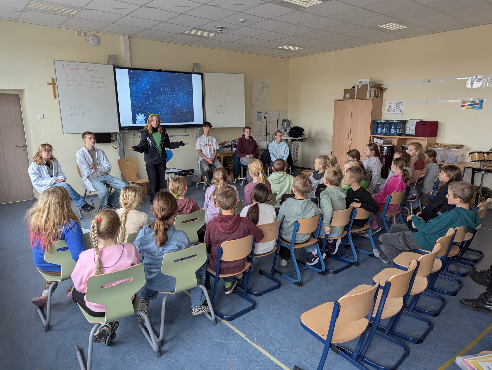 Auch die Dritt- und Viertklässler kamen nicht zu kurz. Sieben Schülerinnen und Schüler der FSH Börger kamen in die Grundschule und führten den Comic „Our flight to the moon“ in englischer Sprache in Theaterform vor. Damit setzten sie das diesjährige Motto des Vorlesetags „Vorlesen spricht deine Sprache“ perfekt um und begeisterten ihr Publikum vollends.