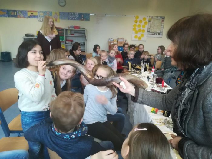 Im Klassenraum hatte Frau Goldmann eine kleine Ausstellung aufgebaut. Sie präsentierte daraus eine reich verzierte Thorarolle aus Pergament, auf die mit der Hand die fünf Bücher Mose geschrieben standen und aus der in den jüdischen Gottesdiensten gelesen wird. „Wir dürfen die Thorarolle nicht berühren, so wichtig ist sie für uns“, erklärte Frau Goldmann. Den Kindern wurde anschaulich vermittelt, dass die hebräische Schrift ganz andere Schriftzeichen als die lateinische hat. Alle Kinder zeigten sich darüber verblüfft, dass die Schriften von rechts nach links geschrieben sind. Dann setzte Goldmann auf anschauliche Weise die mitgebrachten jüdischen Gegenstände ein, um das Vorwissen der Kinder zu aktivieren und um Neues zu vermitteln. Ein Kind durfte sogar den Gebetsmantel (Tallit) und die Gebetsriemen anlegen sowie eine Kippa aufsetzen. Ein besonderer Höhepunkt war, als Inessa Goldmann das Schofar Horn und seine Bedeutung für das Judentum erklärte und die Kinder selbst versuchen durften, dem Instrument einen Ton zu entlocken.