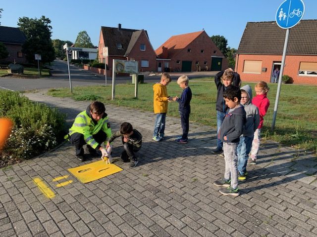 Auch in diesem Jahr haben die Erstklässler den sicheren Weg zur Schule erkundet. Der Polizist Thorsten Eilers sprühte dafür mit jedem Kind gelbe Fußabdrücke an einer Verkehrsinsel und übte das richtige Überqueren der Straße. Im Sachunterricht wird die Schulanfangsaktion „Kleine Füße – sicherer Schulweg“ weiter aufgegriffen. Schulweglotsen helfen an verkehrsreichen Stellen zusätzlich dabei, den Weg zur Schule noch sicherer zu machen.