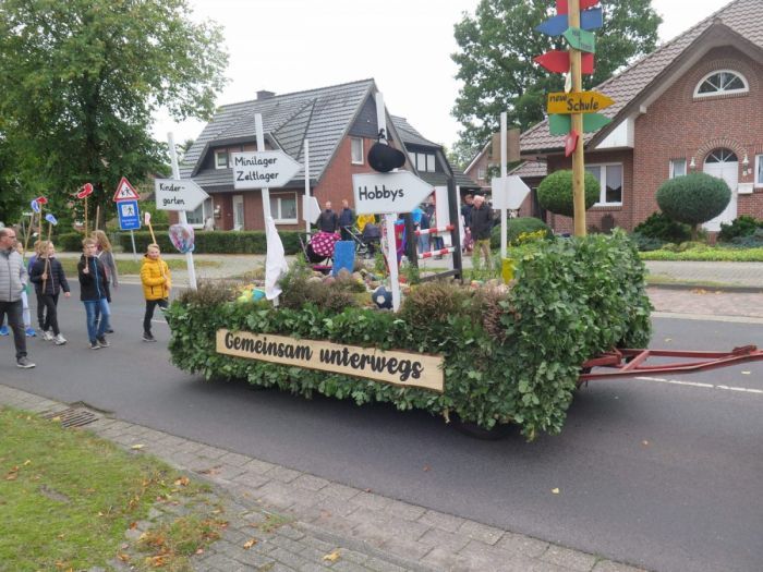 Bei trockenem, aber kaltem und windigem Wetter fand der diesjährige Kirmesumzug in Börger statt. Die einzelnen Klassen hatten sich wieder phantasievolle Gestaltungen der Fußgruppen einfallen lassen und auch der traditionelle Kirmeswagen der vierten Klassen verdiente sich große Aufmerksamkeit. „Gemeinsam unterwegs“ lautete das Motto und Kinder und Eltern hatten für die Darstellung des Lebensweges von der Geburt bis zum weiteren Werdegang während und nach der Kindergarten- und Grundschulzeit als optischen Augenschmaus einen vielbeachteten Motivwagen gebaut. Mit dem verdienten zweiten Platz bei der Prämierung würdigte die Kommission die viele Arbeit und die beeindruckende Ausführung! Wenn unsere Kinder als „Raupe Nimmersatt“, „Mein erster Schultag“ oder als „Wandernde Fußstapfen“ trotz eisiger Kälte fröhlich und als bunte Schar durch Börger zogen, zeigt dies: Kirmes in Börger ist ein Fest für Jung und Alt. Die Gemeinde Börger belohnt diesen Einsatz der Kinder in jedem Jahr, indem die Klassenkassen der einzelnen Jahrgänge eine Finanzspritze erhalten und sich alle Kinder bis zur sechsten Klasse am Samstag ein umfangreiches Gutscheinheft abholen dürfen. Hier muss auch erwähnt werden, dass ohne die tatkräftige Hilfe der Väter und Mütter die Teilnahme am Umzug so nicht gewährleistet wäre. Ein großer Dank dafür auch von der Schule!