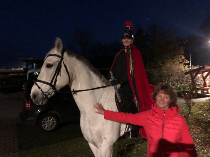 Der anschließende große Umzug durch die Ortsmitte zum Josefstift wurde von der Jugendgruppe der Hümmlinger Musikanten begleitet und von der örtlichen Freiwilligen Feuerwehr abgesichert. An der Spitze der bunten Schar aber ritt der Heilige Martin (Lena S.) auf seinem weißen Pferd (Paul). Er trug den roten Offiziersmantel, den römischen Federhelm und das glänzende Schwert und man glaubte den echten Martin vor Augen zu haben.