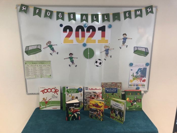 Seit vielen Jahren betreut Frau Ubbenjans unsere Schulbücherei. Immer wieder werden neue Bücher zu verschiedenen Themenbereichen angeschafft, um die Attraktivität unserer Bibliothek aufrecht zu erhalten. Nach Absprache der Fachlehrer können die Kinder dann an festen Tagen die Bücherei besuchen und sich Lesestoff mitnehmen. Das Interesse der Schülerinnen und Schüler am gebundenen Buch ist nach wie vor groß, trotz digitaler Angebote und vielfältiger Verlockungen der Freizeitindustrie. Gerade auch in Coronazeiten ist das Lesen noch einmal populärer geworden. Vor der Bücherei steht auf dem Flur immer ein schön gestalteter Büchertisch zu wechselnden Themen. Auch wenn unsere Mannschaft bei dieser EM leider nicht so erfolgreich war, hat Frau Ubbenjans einen Thementisch zur EM wieder als Blickfang schön und interessant gestaltet, mit Postern und Plakaten und vielen Büchern zum Thema Fußball. Ob es um das Thema Bienen, Freundschaft, Pflanzen oder Abenteuer geht. Der Büchertisch lädt die Kinder zum Stöbern und Schmökern ein. Komm, wir gehen in die Bibliothek, dort entdeckst du die faszinierende Welt der Bücher!