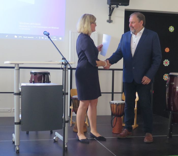 Coronabedingt musste die Anzahl der Feiernden begrenzt werden, aber die langjährigen Weggefährtinnen und Weggefährten sowie Vertreter der Ämter und Dienststellen waren der Einladung des Schulträgers zu dieser Veranstaltung gerne gefolgt. Frau Jutta Reinhardt, zuständige schulfachliche Dezernentin der Landesschulbehörde zeichnete in ihrer Rede den abwechslungsreichen beruflichen Werdegang des Pensionärs nach und überreichte ihm die Entlassungsurkunde der Behörde, verbunden mit einem Dankesschreiben des Dienstgebers für die langjährige Arbeit. Nach seinem Studium des Lehramtes für Grund- und Hauptschulen an der Universität Osnabrück verließ Schröer Niedersachsen und arbeitete für das Bistum Osnabrück von 1982 bis 1989 in der Jugendarbeit und als Religionslehrer in Schleswig Holstein. In den Pfarrgemeinden St. Vicelin in Oldenburg/i.Holstein, St. Ansgar in Heiligenhafen und St. Franziskus Xaverius in Burg auf Fehmarn war er in verschiedenen Bereichen der kirchlichen Arbeit tätig. 1989 wechselte er in den Schuldienst des Landes Schleswig Holstein und unterrichtete bis 1996 an der Grundschule am Wasserquell in Oldenburg/H. .