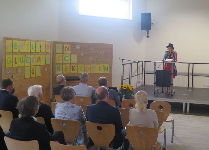 Am Freitag, den 01.07.2022, haben wir in der Schule die Amtseinführung unserer neuen Rektorin Frau Annika Helle gefeiert. Der wichtigste Teil der Feier fand ganz zu Beginn statt: die schulfachliche Dezernentin Frau Jutta Reinhardt übergab Frau Helle feierlich die Urkunde zur Ernennung als Rektorin.