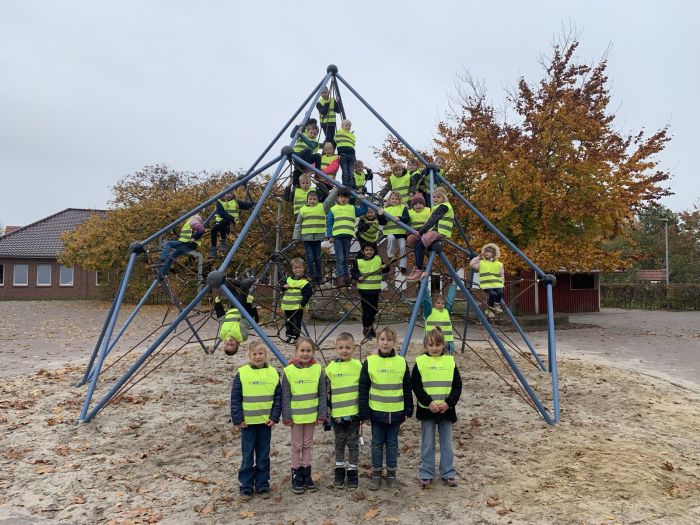 Die Kinder haben im Vorfeld im Sachunterricht besprochen, warum es besonders im Herbst und Winter wichtig ist, im Straßenverkehr gut sichtbar zu sein. Nachdem sich alle einig waren, dass helle Kleidung mit Reflektoren die beste Wahl für die dunkle Jahreszeit ist, haben sich alle sehr über die neuen Warnwesten gefreut.