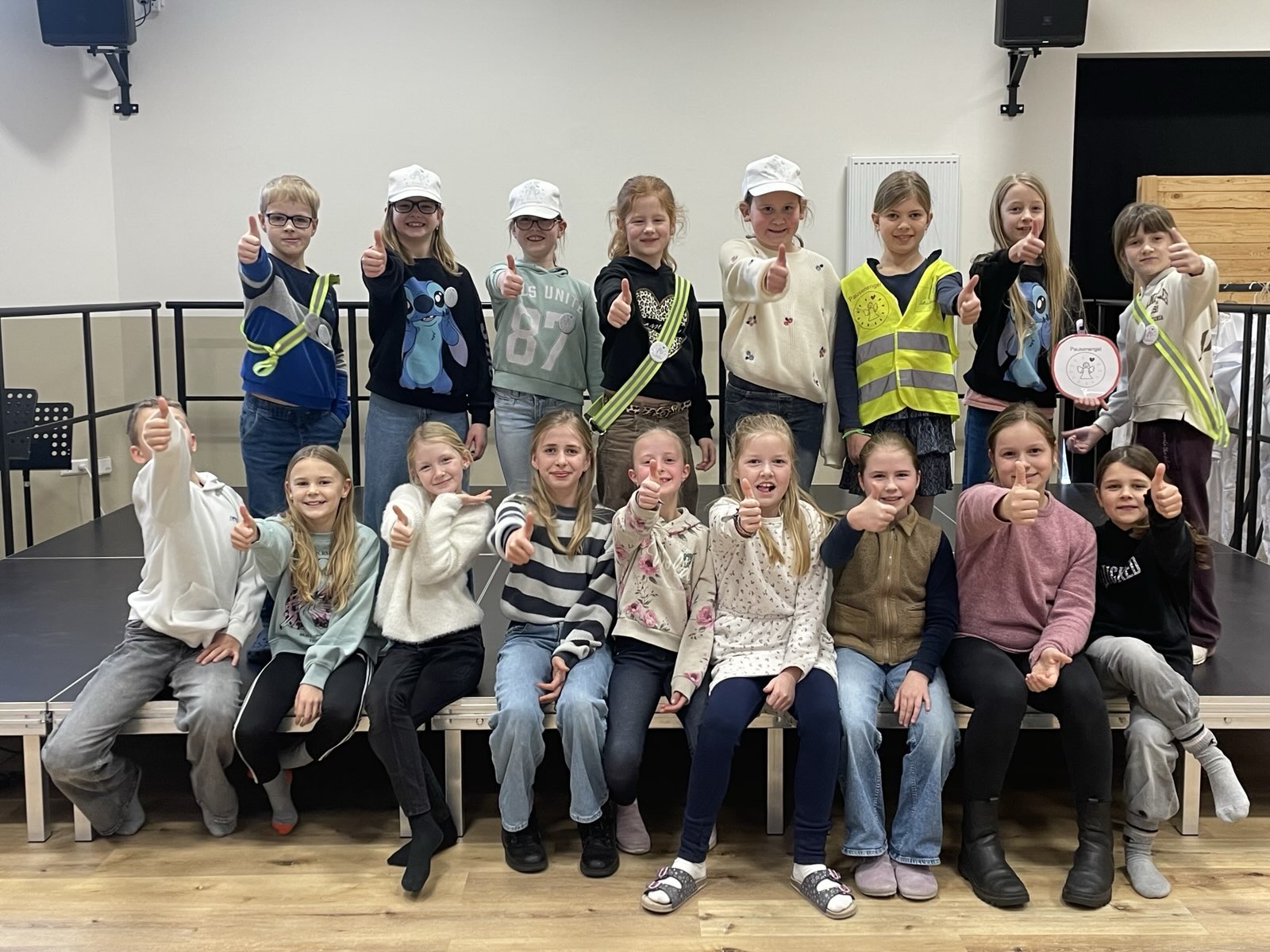 Die Kinder haben im Vorfeld im Sachunterricht besprochen, warum es besonders im Herbst und Winter wichtig ist, im Straßenverkehr gut sichtbar zu sein. Nachdem sich alle einig waren, dass helle Kleidung mit Reflektoren die beste Wahl für die dunkle Jahreszeit ist, haben sich alle sehr über die neuen Warnwesten gefreut.